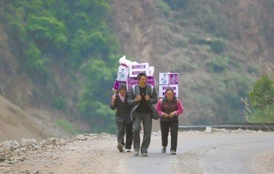 3位村民背着领取的救灾方便面走在路上,从他们家走到县城要2个多小时。