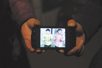 昨日,河北平山县两河村,两位伤心的母亲用手托着手机里两个孩子生前的照片,小怡(左)和小凝。新京报记者 侯少卿 摄