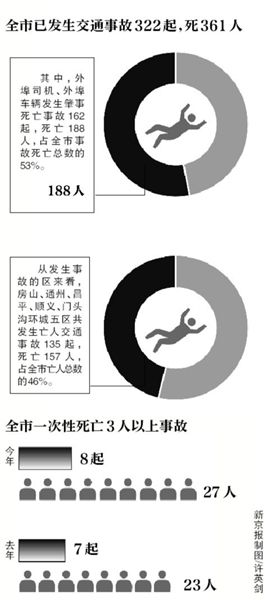 昨天下午3点,市交管局四楼大会议室坐满了来自全市40多个政府部门和交通安全单位的负责人。会上播放的短片显示,今年全市已发生亡人交通事故322起,死亡361人。区县当中,顺义同比增加15人,大兴增加10人,是事故上升最多的两个区;非法改装车上路、无证三轮摩托非法揽客、郊区公路标示不清等问题引人关注。