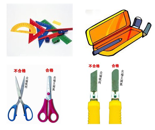 最后,还要考虑安全问题,手工剪刀、刀片应为圆弧顶端,不应为锐利尖端;应注意笔帽安全,笔帽的直径应大于16mm,笔帽体上需要有一条连续至少6.8平方毫米的空气通道,这样可减少使用者误吞后窒息的危险;练习本、课本不能太白(亮度应不大于85%),太白了会刺激、损伤学生的眼睛,影响视力。