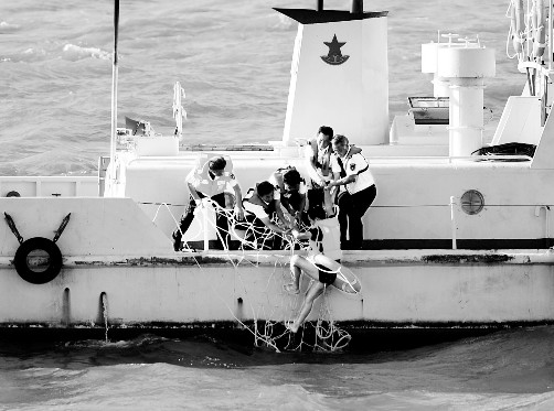 日前,2013年浙江省商渔船安全警示教育推进会暨“平安渔业”海陆空立体救助演练活动在浙江舟山岱山渔家傲码头举行。多艘海洋与渔业系统、海事系统、救助系统的主力船艇以及救助飞机参与了演练。图为参与演练的“中国渔政33128”船舶救起1名“落水”人员。
