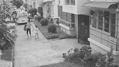 11点20分50秒,一名保安远远走来,后面还跟着一名穿红色T恤的小男孩(小依),男孩双手拿着绿色的塑料玩具。