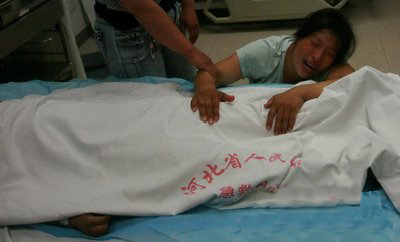 昨日20时许,记者在河北省人民医院急诊室见到了小鹏的母亲高女士。高女士跪趴在儿子的遗体上,放声痛哭。