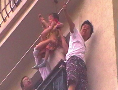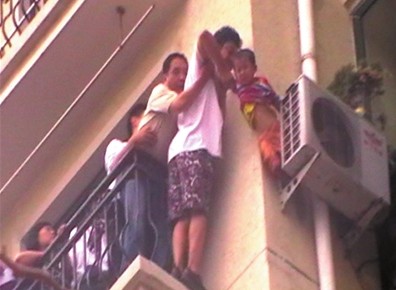 施救者踩在阳台边缘拉出男童,其他人辅助。