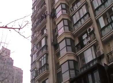 成功救出男童,施救者向楼下围观者挥手示意。