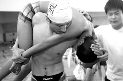 靠近溺水者后,救生员首先应帮助使他的头部浮出水面,在确定对方颈椎没有受伤的情况下,用一个手臂绕过对方腋下,将其救离泳池。由于此时溺水者已经喝了不少水,处于昏迷状态,救生员应立即扛起他,用肩部顶住他的心脏部位,将他带到较平坦的地面轻轻放下。