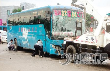 “校车被客车撞上了绿化带,事故中有好几个人受伤。”记者接到报料来到现场时,只见一辆车牌号为粤JQ3166的客车,停在江海三路转入金溪一路的路口处,客车的车头损坏严重,挡风玻璃整体碎裂,车身一边的玻璃窗脱落,路面洒落大量玻璃碎片等杂物;在另一车道的路边,停着一辆车身上写着“阳光学校”字样的校车,校车的车身严重凹陷。