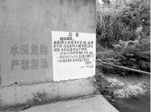 据附近村民介绍,这个水池平时用来蓄水灌溉的,山上还有个大水库。为防止有人私自下水游泳,水库周围都筑了围墙栏杆,安装了大门,是进不去的,边上还有明显的警示语,没想到在下面这个蓄水池却出了事。