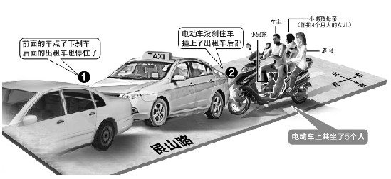 载着5人的电动车,“追尾”出租车