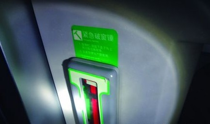 每节车厢中有4个紧急逃生窗(有红点的玻璃窗),这些玻璃上均有特殊涂料。它不仅可以避免敲碎时四处溅射和尖角伤人,而且一旦被敲碎,它只会向车厢外侧方向倾倒碎裂。