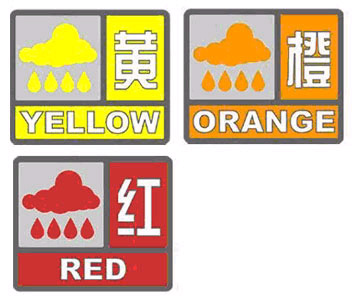 暴雨预警信号分四级,分别以蓝色、黄色、橙色、红色表示。