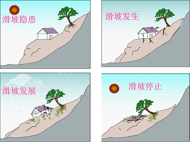 ① 新滑坡;② 古滑坡;③老滑坡;④正在发展中滑坡。