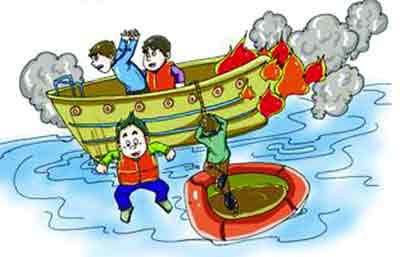 (2)当客船在航行时机舱起火,机舱人员可利用尾舱通向上甲板的出入孔逃生。船上工作人员应引导船上乘客向客船的前部、尾部和露天板疏散,必要时可利用救生绳、救生梯向水中或来救援的船只上逃生,也可穿上救生衣跳进水中逃生。如果火势蔓延,封住走道时,来不及逃生者可关闭房门,不让烟气、火焰侵入。情况紧急时,也可跳入水中。