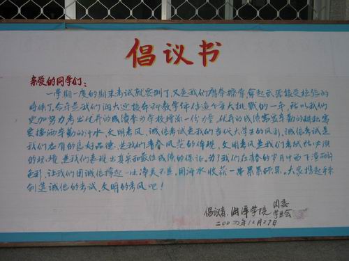 同学们,我们肩负着重要的历史使命和责任,承载着祖国、社会和家人的殷切期望,让我们秉承石大“惟真惟实”的校训,继承“勤奋、严谨、求实、创新”的优良学风,从现在开始,严格要求自己,做有理想、有道德的时代青年,刻苦学习,诚信做人,文明应考,通过我们共同的努力营造良好学习考试氛围。