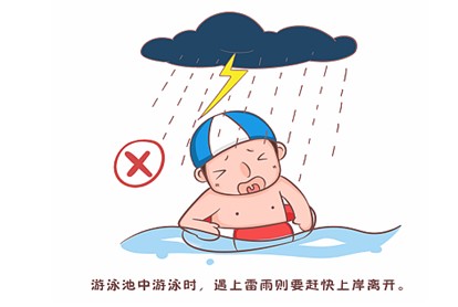 7、在江、河、湖泊或游泳池中游泳时,遇上雷雨则要赶快上岸离开。因为水面易遭雷击,况且在水中若受到雷击伤害,还增加溺水的危险。另外,尽可能不要呆在没有避雷设备的船只上,特别是高桅杆的木帆船。