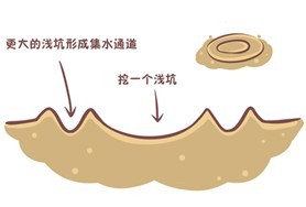 ①在斜坡上挖一个浅坑,外围再挖一个更大的浅坑形成集水通道。内外圈以隆起的土堆区隔开来。
