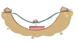 ②将大塑胶袋罩在浅坑上,以木棍撑起,内侧再以石头压住。在浅坑中央放置绿色数叶及青草。