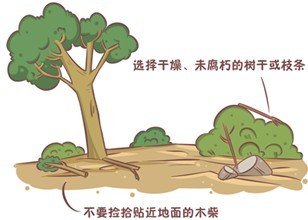 (2)捡拾干柴:干柴要选择干燥、未腐朽的树干或枝条。要尽可能选择松树、栎树、柞树、桦树、槐树、山樱桃、山杏之类的硬木,此类干柴燃烧时间长、火势大、木炭多。不要捡拾贴近地面的木柴,贴近地面的木柴湿度大,不易燃烧,且烟多熏人。