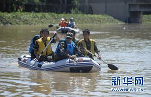 资料图片:7月22日,救援人员划着冲锋舟在水上进行搜索。记者从北京消防部门了解到,21日的强降水导致京港澳高速公路16公里处一铁路桥下严重积水,导致多台车辆被淹。