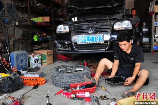 7月24日下午,北京朝阳东五环附近一大型汽配城内,修理进水车的人逐渐增多,大部分修理店铺门口都停放着等待或正在维修的进水车辆,部分生意好的店铺由于人手不足等原因已无法再接新单。图为修车师傅正在修理过水车。