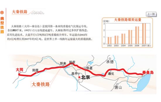 大秦铁路自山西省大同市至河北省秦皇岛市,纵贯山西、河北、北京、天津,全长653千米,是中国西煤东运的主要通道之一。大秦铁路是中国新建的第一条双线电气化重载运煤专线,1992年底全线通车,2002年运量达到一亿吨设计能力。为最大限度发挥大秦铁路作用,有效缓解煤炭运输紧张状况,自2004年起,铁道部对大秦铁路实施持续扩能技术改造,大量开行一万吨和两万吨重载组合列车,全线运量逐年大幅度提高。