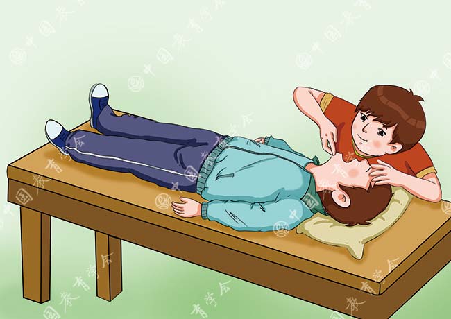 第一步:将伤者仰卧于坚实的平面上,将右手食指与中指沿着肋骨边缘滑至胸骨下端的剑突位置;