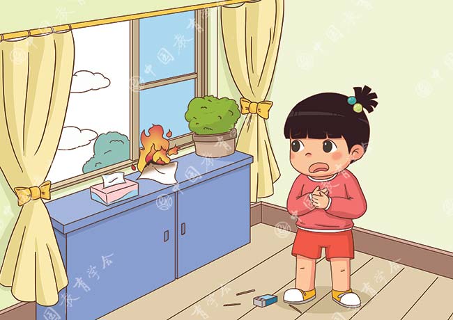 “哎哟!”糟糕,火柴烧到了手指,于是彤彤赶忙一扔。不料,未灭的火柴刚好落在了窗台上的纸巾上,眼见着燃起火来。
