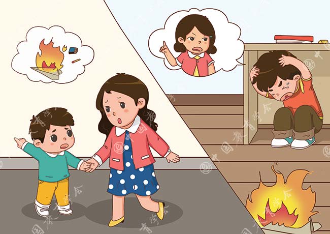 如果因玩火不小心引燃了物品时,千万不要害怕被责骂而躲藏起来。应赶紧去告诉父母或身边的大人,这样可以趁火势不大时及时将火扑灭,以免酿成火灾。